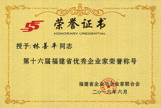 為弘揚(yáng)優(yōu)秀企業(yè)家深化改革、科學(xué)管理、與時(shí)俱進(jìn)、勇于創(chuàng)新的開拓精神,激勵(lì)廣大企業(yè)家敢為天下先、愛拼才會(huì)贏的闖勁,為推動(dòng)福建省產(chǎn)業(yè)轉(zhuǎn)型升級(jí)和經(jīng)濟(jì)持續(xù)健康發(fā)展建功立業(yè),近日,福建省企業(yè)與企業(yè)家聯(lián)合會(huì)組織開展了每?jī)赡暝u(píng)選一次的福建省優(yōu)秀企業(yè)家評(píng)選工作,并于2016年6月24日決定授予98位企業(yè)經(jīng)營(yíng)管理者“第十六屆福建省優(yōu)秀企業(yè)家”榮譽(yù)稱號(hào),虹潤(rùn)公司董事長(zhǎng)林善平榮獲該榮譽(yù)稱號(hào)。