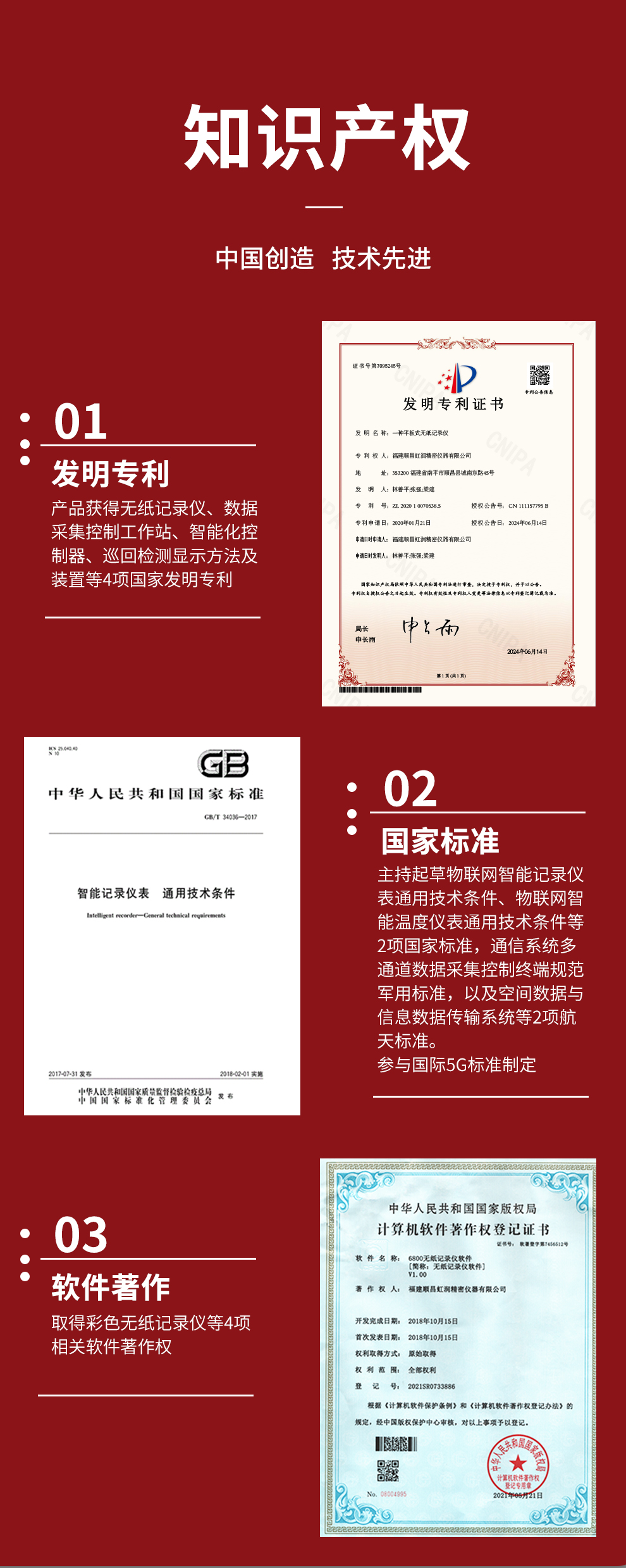 虹潤(rùn)公司是專業(yè)生產(chǎn)無(wú)紙記錄儀的國(guó)家專精特新“小巨人”企業(yè)。生產(chǎn)的彩色無(wú)紙記錄儀,具有8路全隔離輸入,數(shù)據(jù)記錄與轉(zhuǎn)存,配套上位機(jī)管理軟件,RS485/以太網(wǎng)通訊等特點(diǎn)。產(chǎn)品獲得無(wú)紙記錄儀、數(shù)據(jù)采集控制工作站、智能化控制器、巡回檢測(cè)顯示方法及裝置等4項(xiàng)國(guó)家發(fā)明專利;主持起草物聯(lián)網(wǎng)智能記錄儀表通用技術(shù)條件、物聯(lián)網(wǎng)智能溫度儀表通用技術(shù)條件等2項(xiàng)國(guó)家標(biāo)準(zhǔn),通信系統(tǒng)多通道數(shù)據(jù)采集控制終端規(guī)范軍用標(biāo)準(zhǔn),以及空間數(shù)據(jù)與信息數(shù)據(jù)傳輸系統(tǒng)等2項(xiàng)航天標(biāo)準(zhǔn),參與國(guó)際5G標(biāo)準(zhǔn)制定;取得彩色無(wú)紙記錄儀等4項(xiàng)相關(guān)軟件著作權(quán)。產(chǎn)品廣泛應(yīng)用于石化、冶金、電力、制藥、新能源、農(nóng)業(yè)等諸多領(lǐng)域。